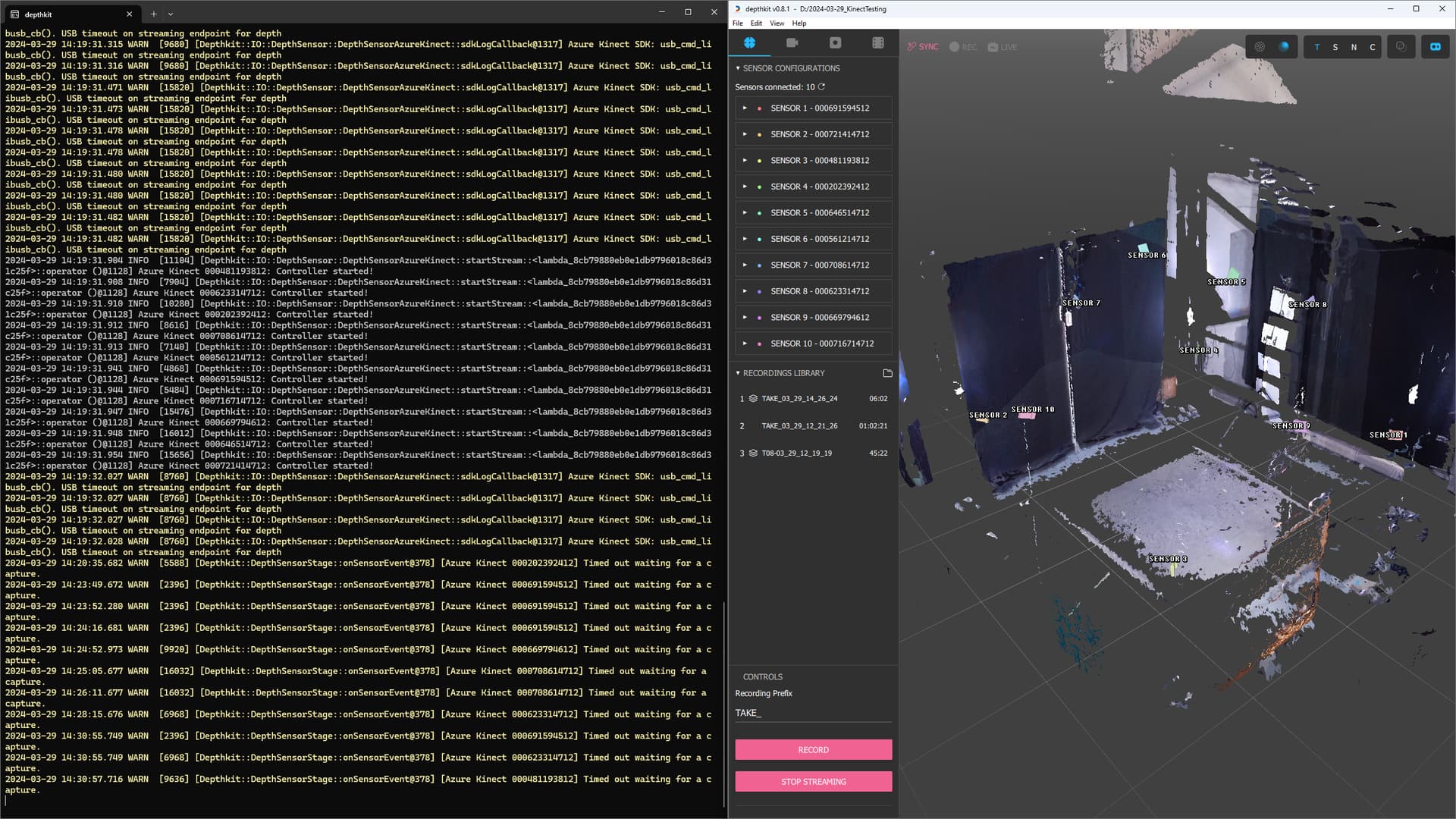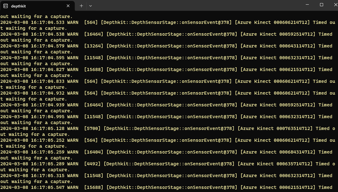 so even though the depth kit studio shows that all sensors are synced, its being timed out causing the low fps, and also not time synced.