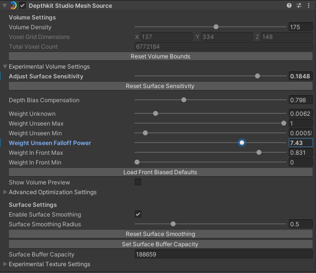 Mesh Reconstruction Settings: This is less effective than fixing the mattes, but in the Unity object’s inspector, under the Depthkit Studio Mesh Source component, you’ll find these settings: