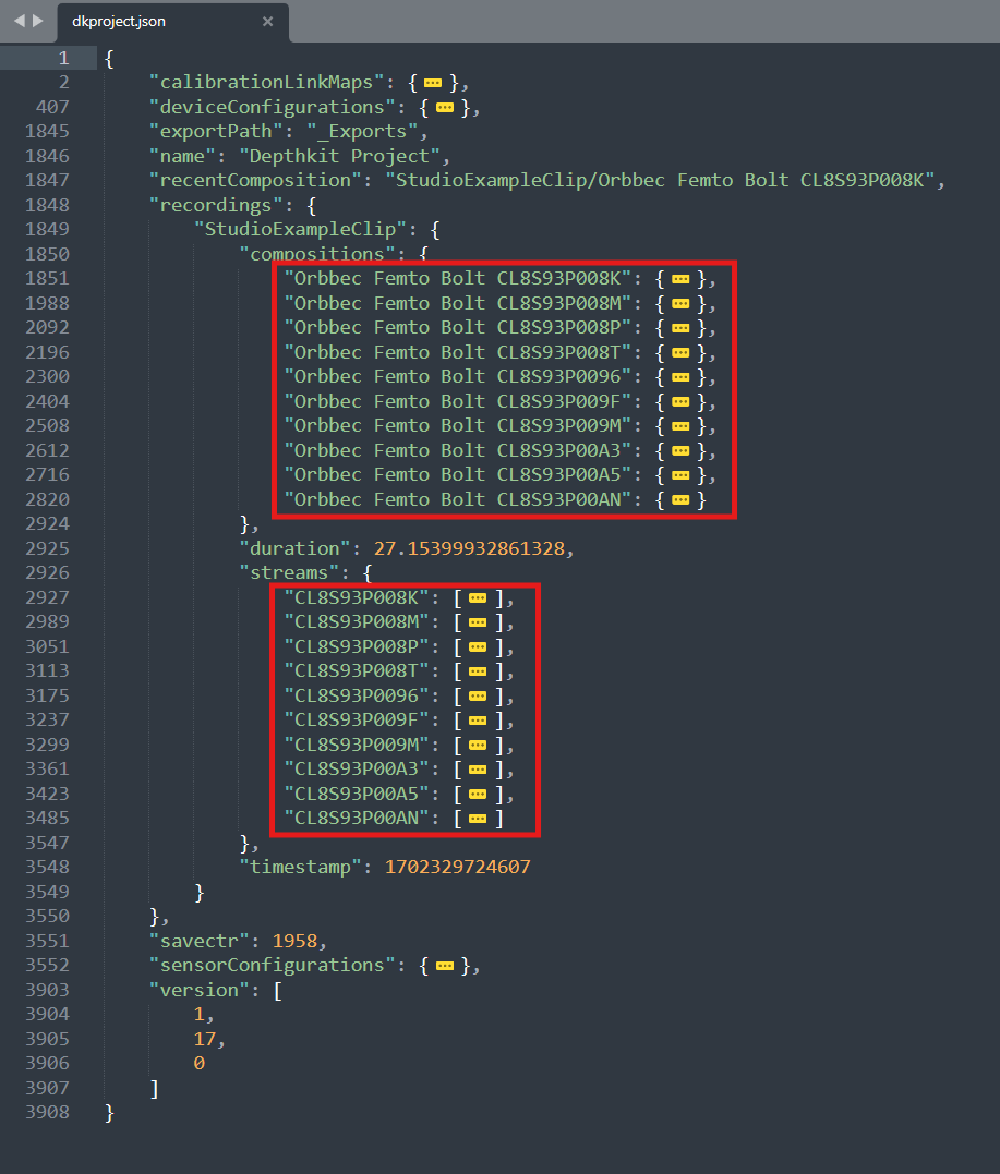 • Locate the take in "recordings"/<TAKE NAME> and the nested objects "compositions" and "streams". Each will contain an array of each of the sensors used to make the Depthkit Studio recording.