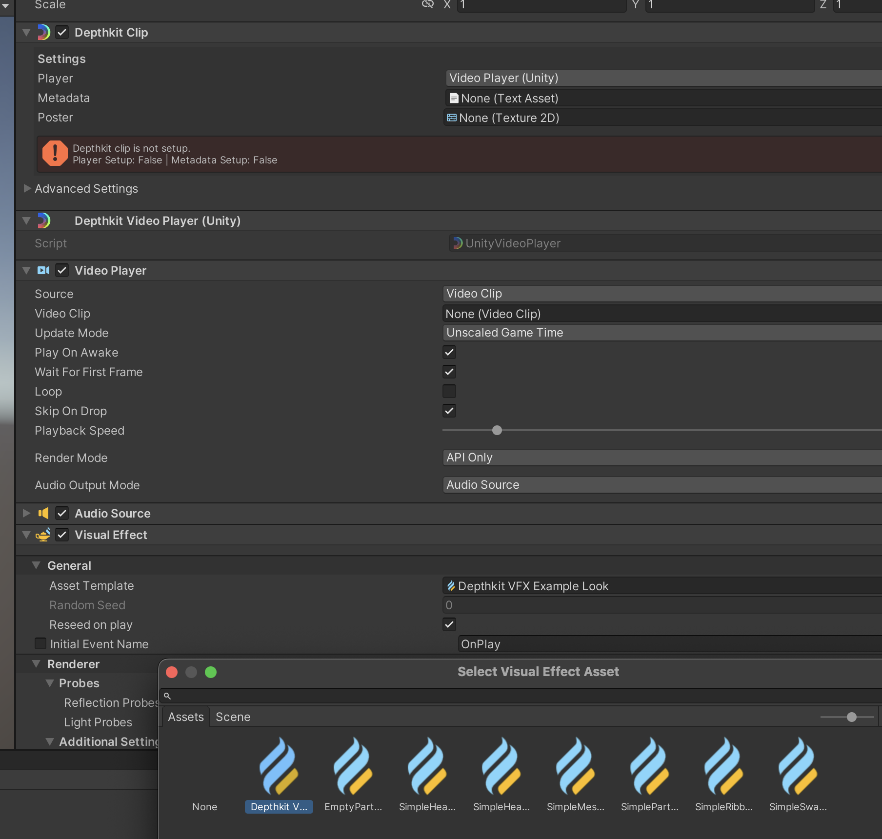 Some users of the Depthkit Expansion Packages for Unity (Phase 10) have flagged that the prefabs for Depthkit VFX Looks fail to import. This will be fixed in the next patch, but in the meantime, here’s a workaround which constructs the example Depthkit VFX Look from scratch: