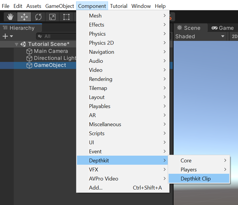 With the game object selected, go to the Component menu, select Depthkit → Depthkit Clip.