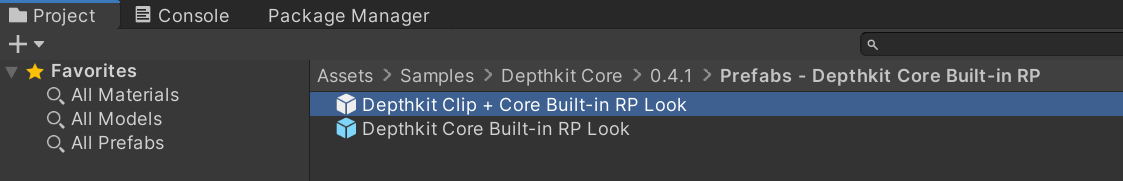 Each Depthkit Core package comes with pre-configured Depthkit clip to get you up and running immediately. Prefabs can be imported via the Package Manager. Once imported, the prefabs become available in your assets folder, in Samples.