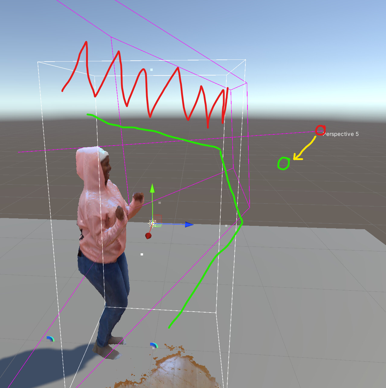 If you have multiple calibration charts (each displaying unique markers so there are no redundancies), you can gather a more accurate floor sample by laying many charts on the floor, ensuring they are all oriented in the same direction (see the arrow at the top of our calibration chart PDF), and then capturing or replacing your floor sample. Depthkit will average the positions of all of the markers in the scene, and make that the origin of the asset. This will enable you to more easily remove the entire floor using the bounding box during editing.