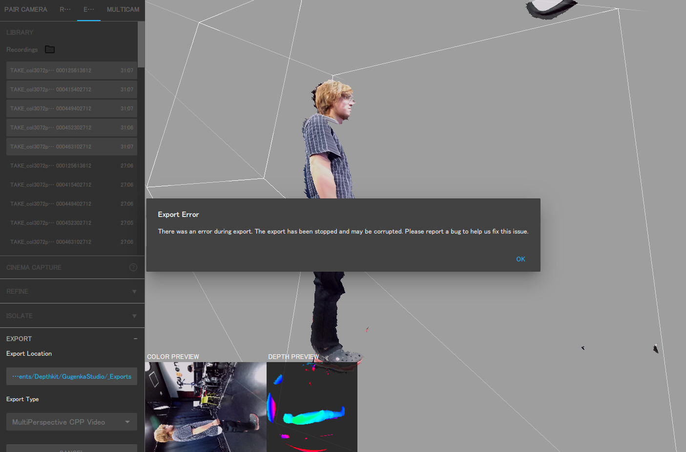 Hi, @KiralPoon. This is often the result of Depthkit attempting to encode a video with a resolution greater than what is supported by the codec. What is the resolution of the resulting Multi-Perspective CPP Image Sequence? It looks like you are using the Azure Kinect’s WFOV Depth Mode - Is this the 1024x1024 WFOV Raw (15Hz) mode? Do you have Refinement enabled for any of the sensors?
