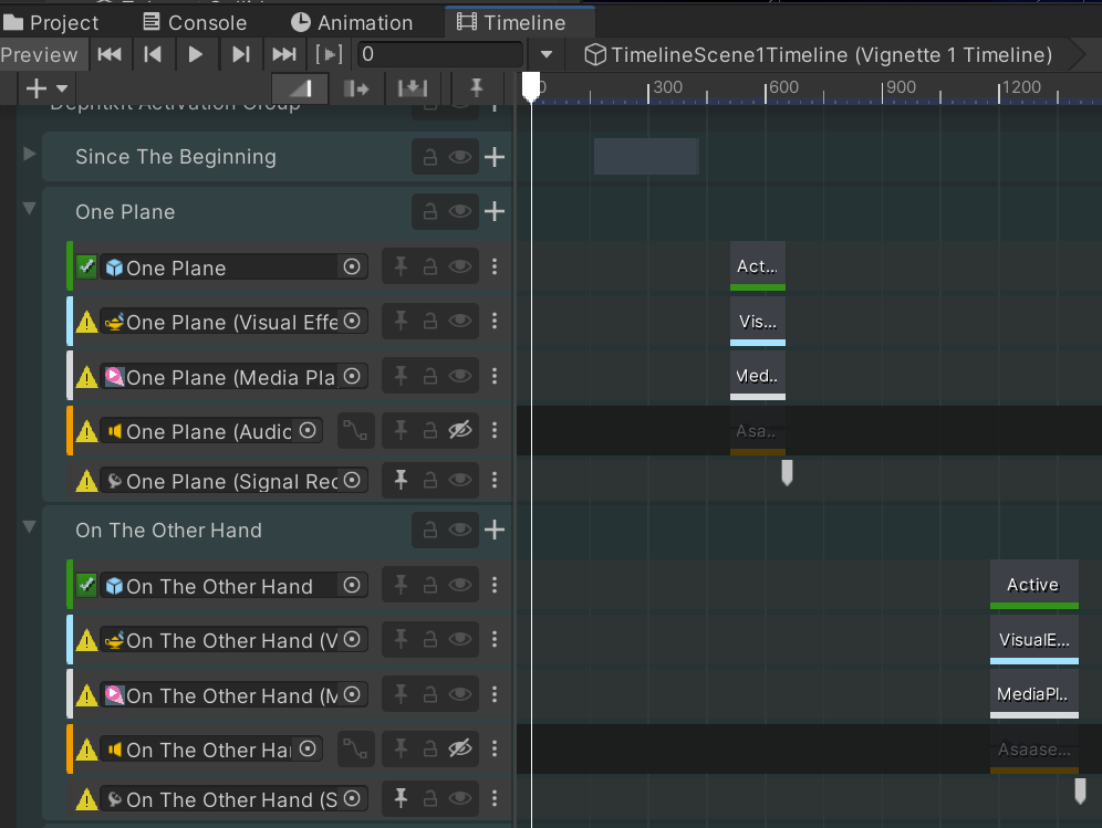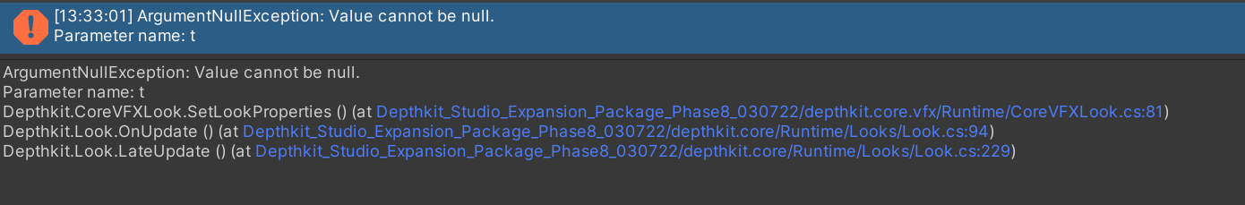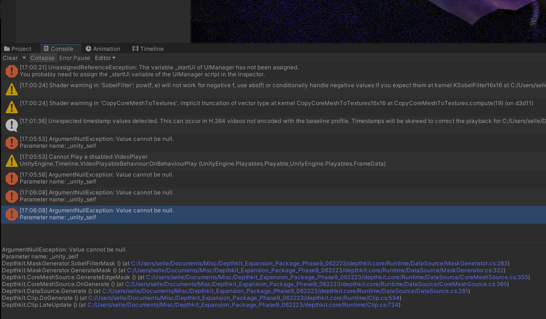 The other 10 Depthkit playback objects were doing this at one point as well, and clicking generating data in the “Depthkit Core Visual Effect Graph Texture Source” solved the issue. However, for 7 of them I generate new data and error stops, then in runtime the error comes back and after exiting the play mode the errors persist until I regenerate the data again. As far as I can tell everything is same between the 10 that are fine and the 7 that aren’t, besides position data and the files video/poster/text files being used in the depthkit and avpro scripts, and that when I hit generate data or playback ends, the 10 that work have their DataWidth and Height reset to 0s in the vfx graph, while the 7 that are giving errors have their DataWidth and Height reset to 1s or 256s. I’ve included screenshots of my timeline showing one of the working clips on top and one of the error clips below it if that helps.