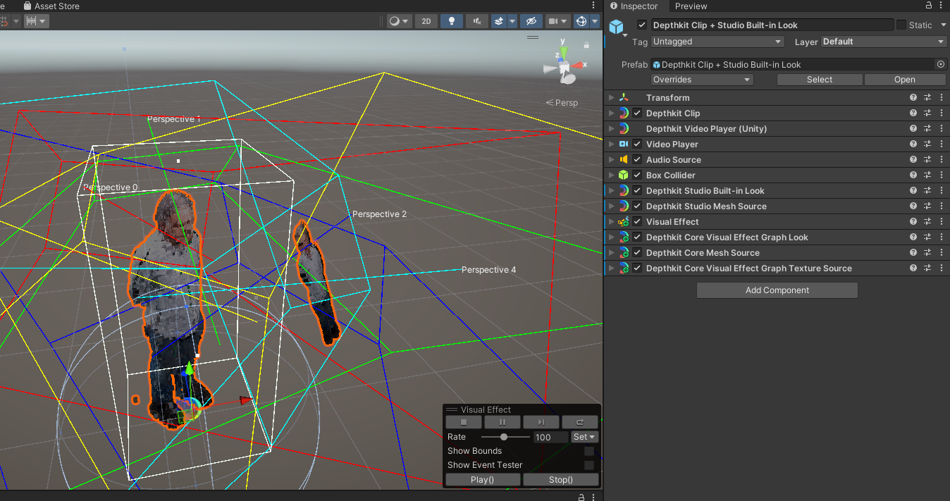 If you want to add the Visual Effects Graph Look to your Depthkit Studio asset, first make sure you are using one of Unity’s scriptable render pipelines (URP or HDRP), then add the Depthkit Studio Visual Effect Graph Look component to your Depthkit object.