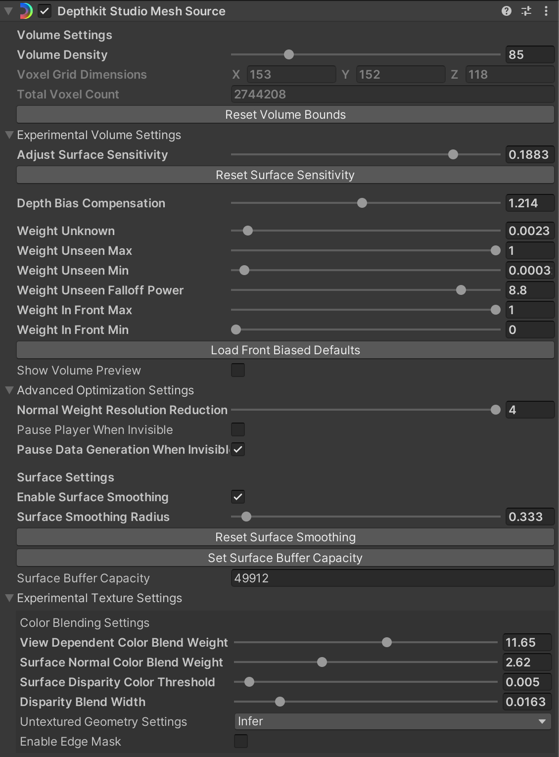 • I increased the Depth Bias from the default of 0.7 to 1.5 (as the depth data of skin, including hands, is prone to error in the Azure Kinect)