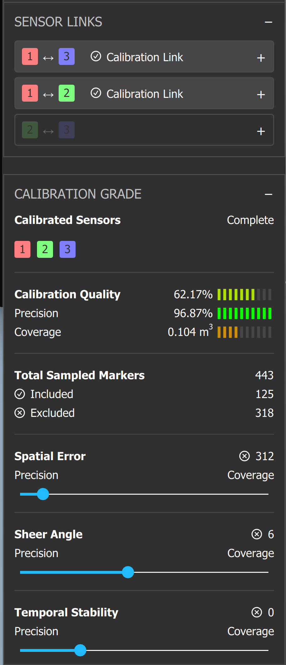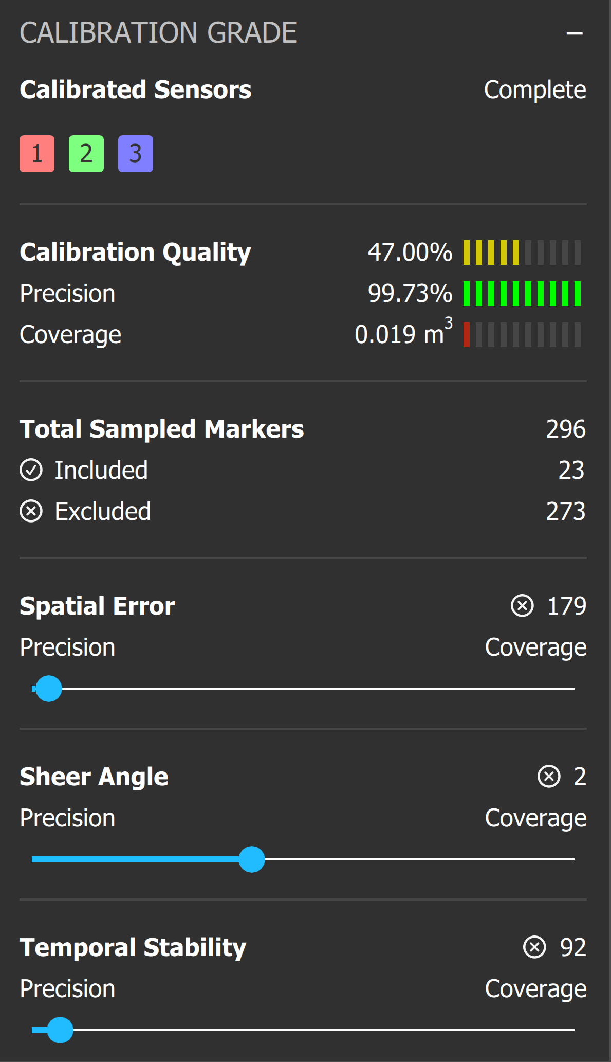 Once you have more samples, you should be able to open up the Spatial Error and Temporal Stability filters and get a better score. With the data it is currently given, you can see that the current filter settings are removing all but 23 markers from your set, which may cause the calibration to align one point in 3D space well at the expense of alignment around the rest of your scene.