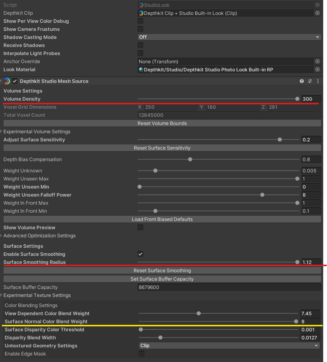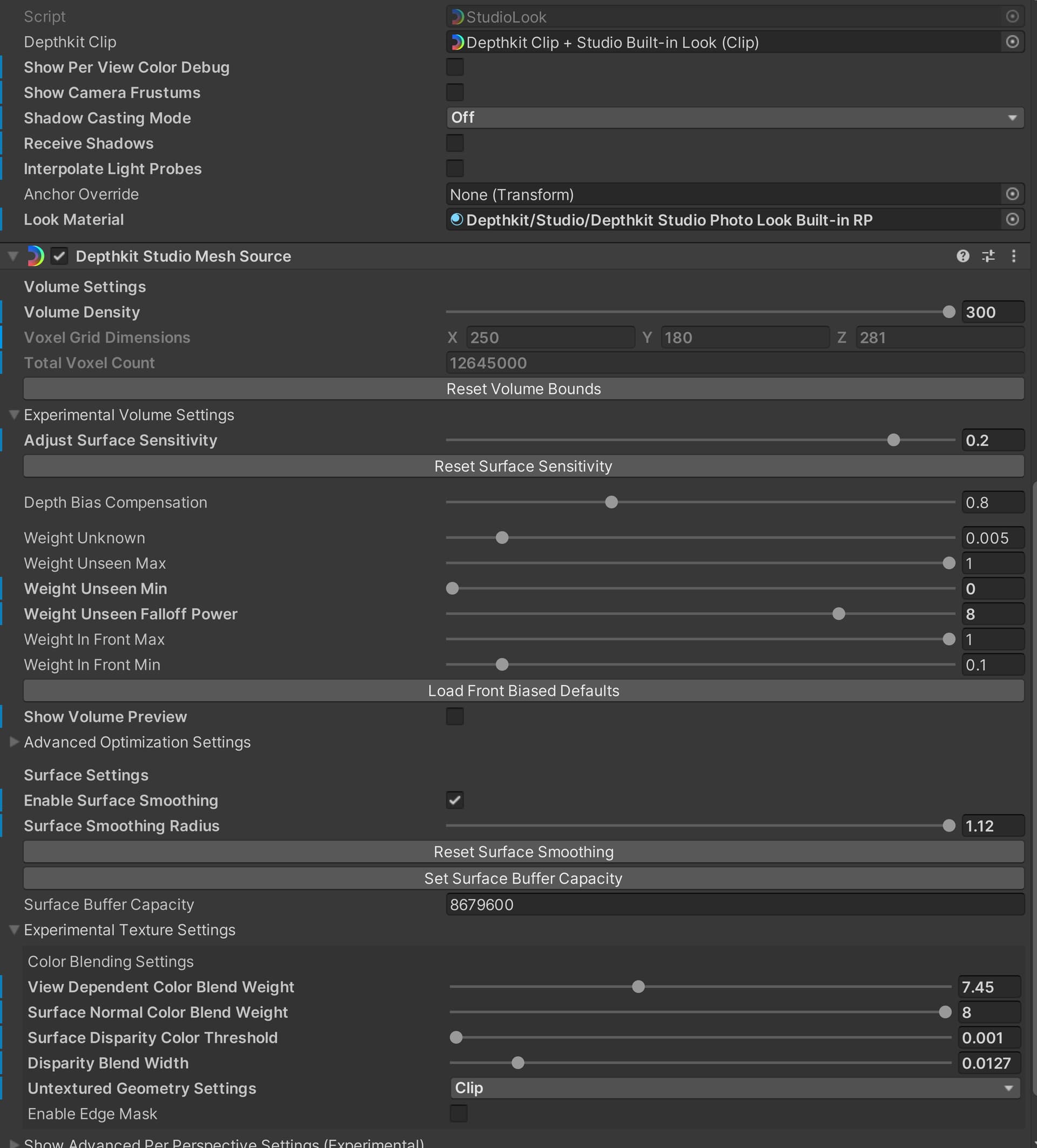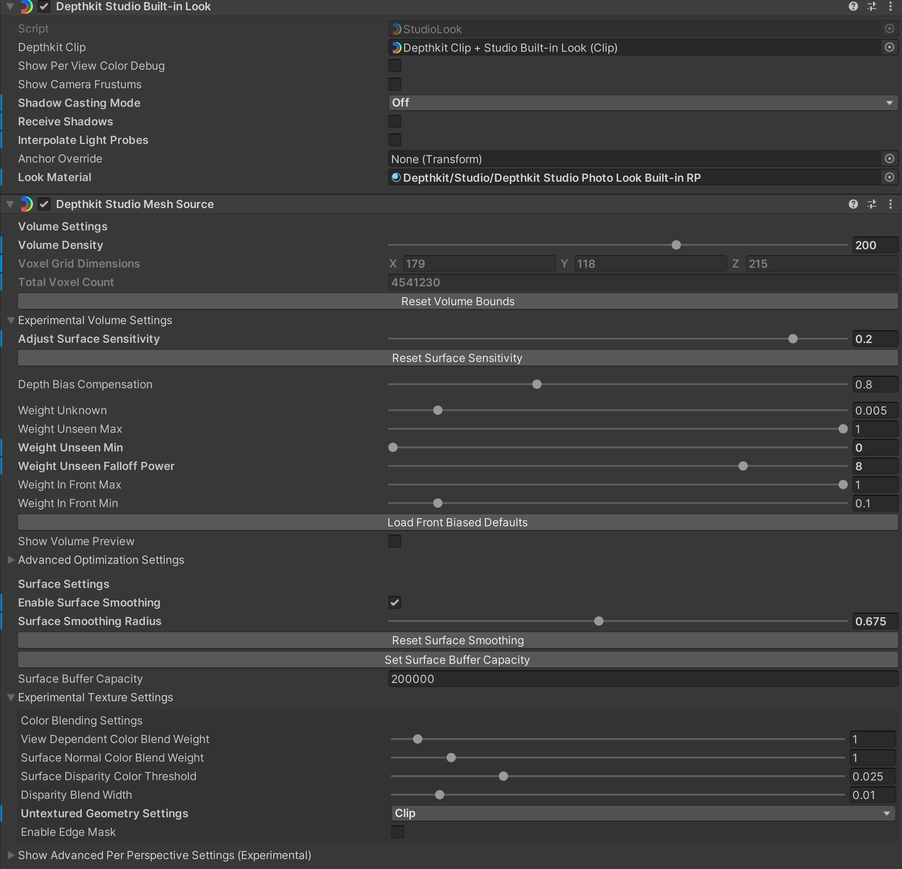 - Depending on the View-dependent Texture settings, the benefits of the close sensor will fade away as the viewer moves off-axis of the center sensor and matches a perspective closer to one of the flanking sensors. You can bias this by lowering the Depthkit Studio Mesh Source component > Experimental Texture Settings > Advanced Per-Perspective Settings > Color Weight Contribution for the flanking sensors.