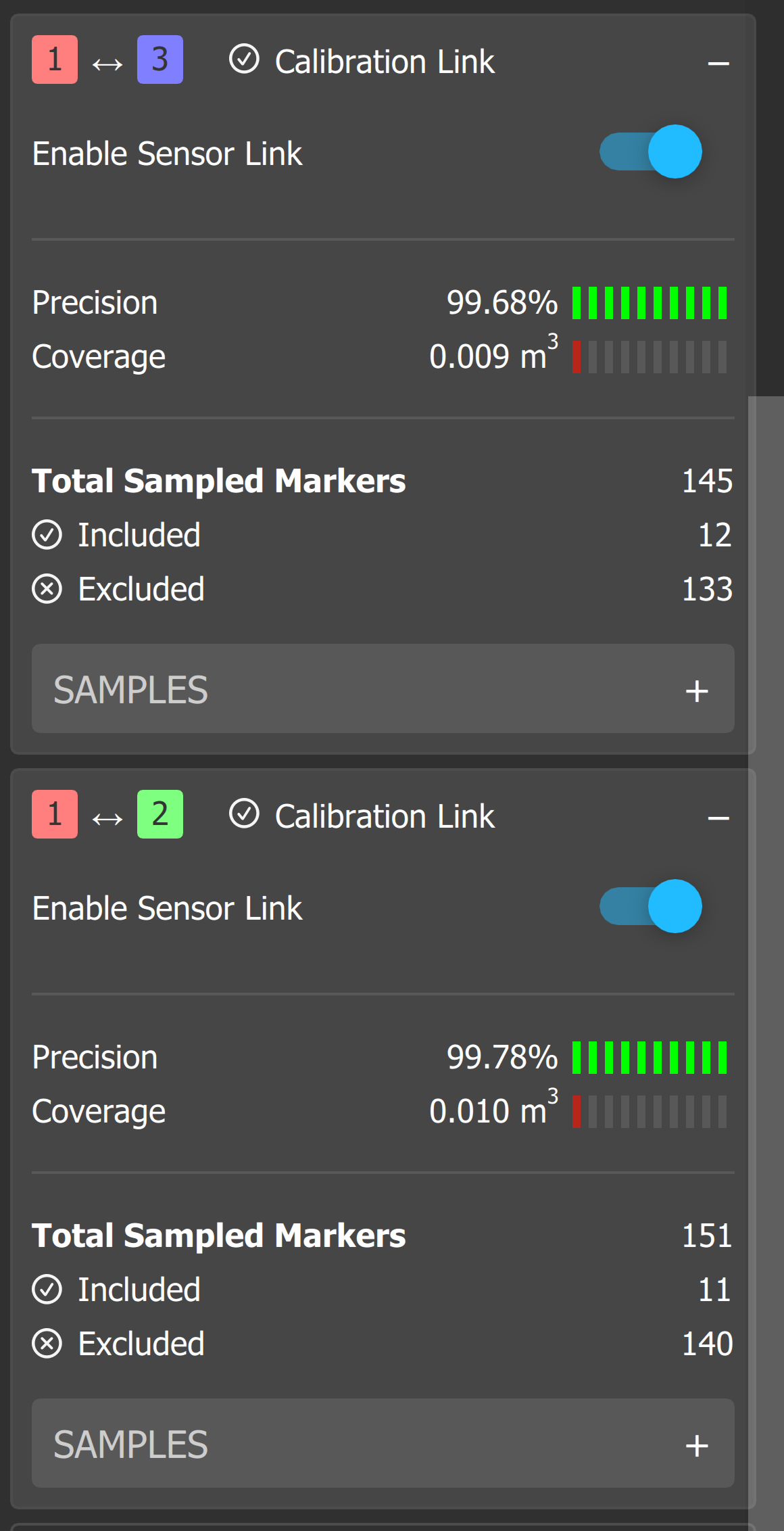 One thing that I think is contributing to the low calibration score is that your calibration samples are all on the same 2D plane (red), at roughly the same distance to the sensors, which is likely why the Coverage metric is so low. To fill that metric up and improve the quality of the calibration overall, collect samples from various positions on that plane, then move the chart to a new plane further from the sensors, and collect another set of samples. The more samples the sensors you collect from more distances, the more useful data the calibration algorithm has to work with.