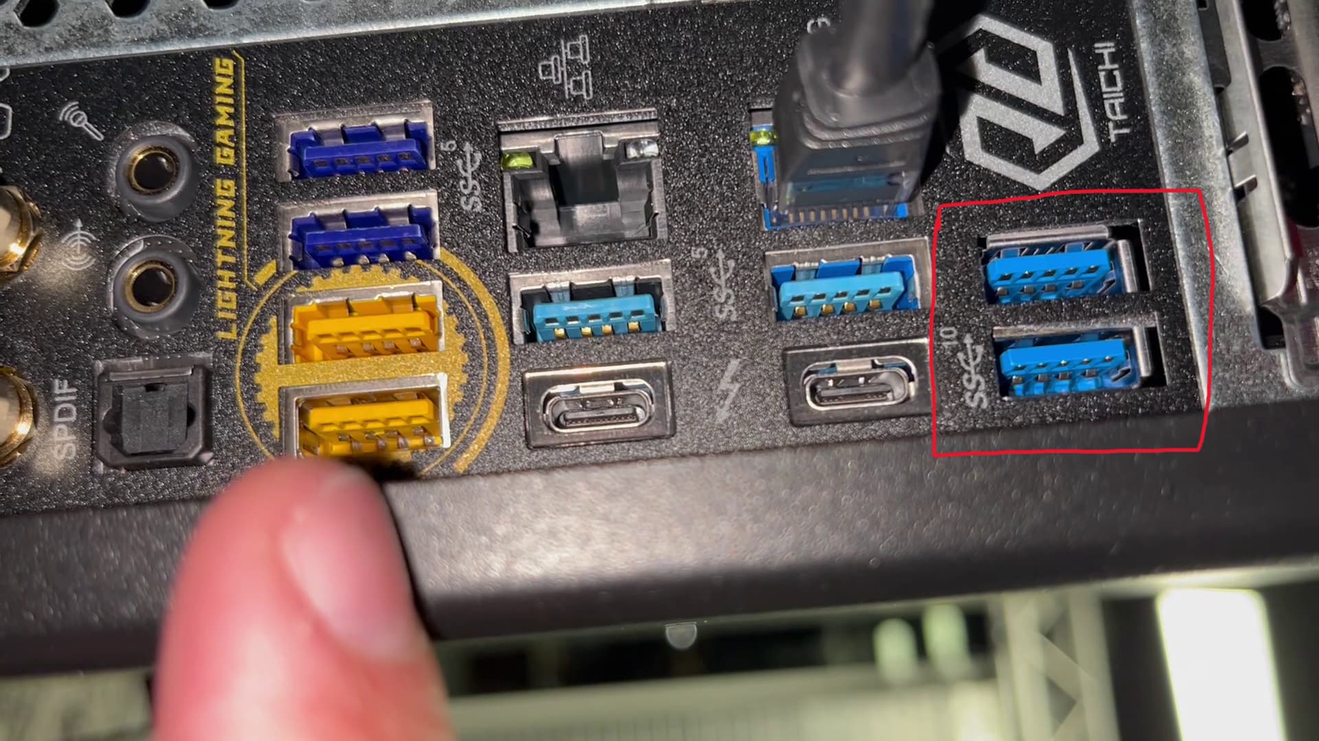 This exact model of computer is tested with Depthkit to capture 10 sensors recording at 1080p color and 640x576 depth. It supports just two PCIe USB cards, meaning a total of 8 sensors can be connected to the PCIe USB ports, leaving two sensors needing to be plugged into the motherboard. The ASRock z790 Taichi motherboard included in the Apexx S3 computer has many USB ports to choose from, but only some are compatible with the Azure Kinect. We have found that the system records reliably when the remaining two sensors are plugged into the two ports closest to the Taichi logo (highlighted in red in this photo), which have fully compatible Intel USB 3.2 controllers behind them.